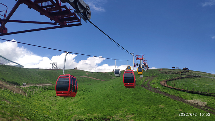 固定抱索器吊廂索道具有方便、高性價比等特點。吊箱采用封閉式,常用配置選擇2人吊箱、4人吊廂。其工作原理是一條閉合的運載索套在索道兩端的驅(qū)動輪及迂回輪上,線路中間設(shè)有支架,支架上裝有托索輪或壓索輪組,隨地形變化將運載索托起或壓下,按一定間距將吊廂用抱索器固結(jié)在運載鋼索上,動力驅(qū)動輪帶動載索,迂回輪實現(xiàn)線路往返來實現(xiàn)運送乘客的目的。2人廂和4人廂索道是景區(qū)觀光交通的性價比高的理想產(chǎn)品,索道的建設(shè)和維護成本相對較低。適合旅游開發(fā)投資前期。固定抱索器的2廂和4人廂索道線路速度和站內(nèi)速度相對一致,線速度可站內(nèi)控制變頻調(diào)速。根據(jù)廂配置,2人廂線路速度可達1米/秒,4人廂的線路速度可達0.8米/秒,乘客乘坐須站內(nèi)工作人員手動開關(guān)門廂門。2人廂和4人廂的選擇,可根據(jù)不同的線路和高差來配置廂的運量和個數(shù),以滿足客戶運營者和使用者的需求。